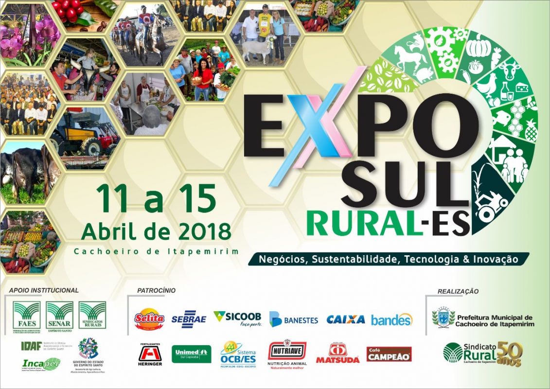A ExpoSul Rural chega em sua segunda edi??o se firmando como a principal feira rural voltada para as necessidades produtor. O espa?o aberto para a realiza??o de neg?cios, n?o perde de vista a necessidade de trazer novas tecnologias, inova??o e sustentabilidade para o campo. A Feira ser? realizada de 11 a 15 de abril, no Parque de Exposi??es Carlos Caiado Barbosa, em Cachoeiro de Itapemirim, e abre o calend?rio estadual do agroneg?cio.
