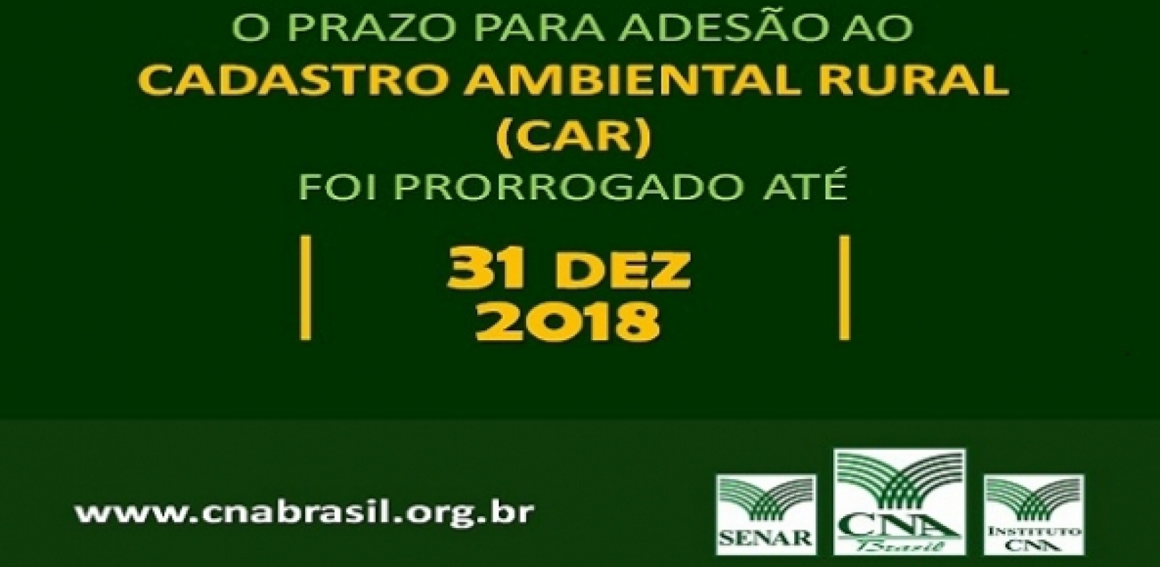 Assim, a CNA alerta todos os produtores que ainda n?o fizeram o cadastramento do seu im?vel no CAR a n?o deixar a inscri??o para a ?ltima hora, pois segundo a entidade, este ? o ?ltimo prazo de prorroga??o poss?vel, previsto na legisla??o vigente.