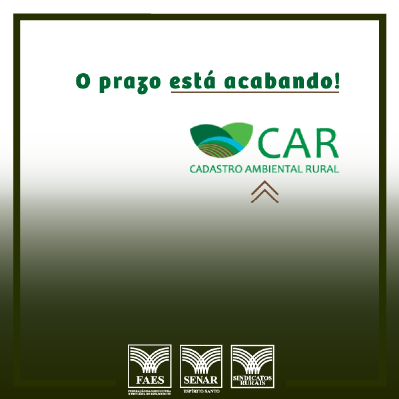 O prazo final para se inscrever no Cadastro Ambiental Rural encerra no pr?ximo dia 31 de dezembro. O cadastro ? obrigat?rio para todas as propriedades rurais do pa?s e pr?-requisito para participa??o em diversos programas, benef?cios e autoriza??es. O gerente executivo da Faes, Murilo Pedroni destaca as restri??es que o propriet?rio pode sofrer caso n?o fa?a o cadastro no per?odo. ?Sem o CAR o propriet?rio n?o vai conseguir proceder a regulariza??o ambiental da propriedade, nem ter acesso ao cr?dito rural, atos cartor?rios e licenciamentos?. Inscreva-se e evite a restri??o de cr?dito agr?cola e outros direitos!