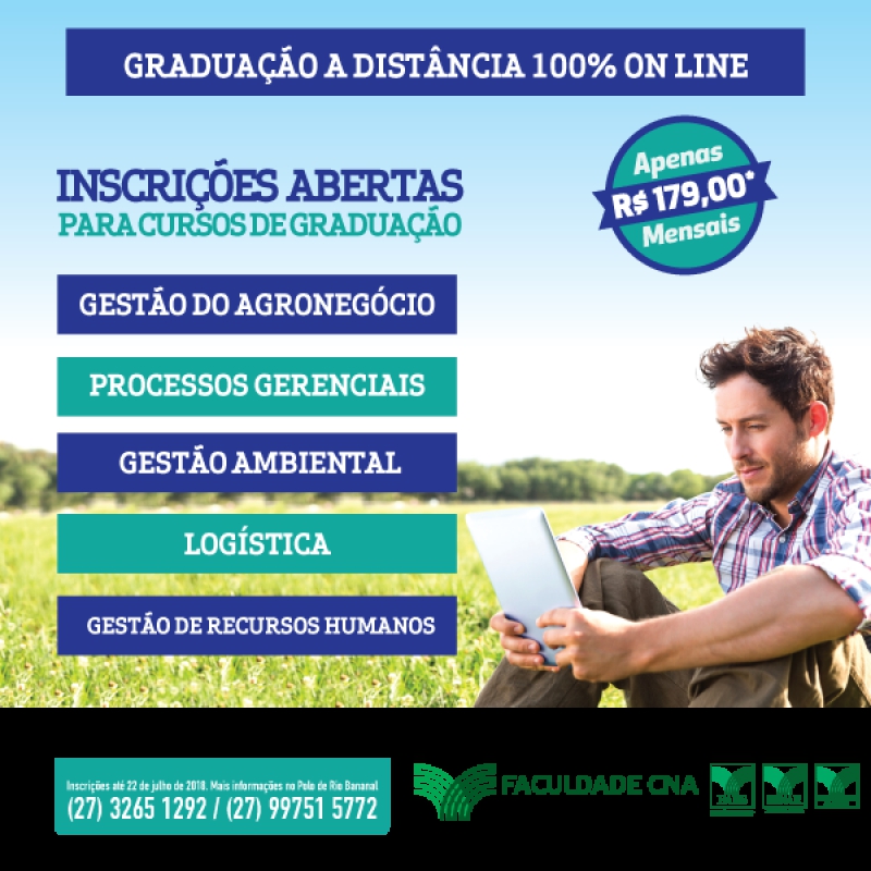 At? domingo (22) ? poss?vel se inscrever para a gradua??o ? dist?ncia da Faculdade CNA no Esp?rito Santo. S?o cinco cursos online e totalmente voltados para o agroneg?cio. O polo de Rio Bananal ? o ?nico da regi?o Sudeste que passou pela avalia??o de dois t?cnicos do MEC e alcan?ou nota suficiente para funcionamento. O presidente da Faes, J?lio Rocha, destaca que o agroneg?cio est? acompanhando as evolu??es tecnol?gicas. ?O Sistema percebeu que neste mundo de transforma??es r?pidas precis?vamos qualificar atrav?s de uma capacita??o tamb?m mais ?gil. Assim, estabelecemos prioridade aos cursos direcionados para o agroneg?cio?, disse.