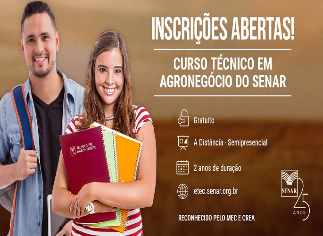 Ter a chance de fazer um curso de n?vel t?cnico certificado pelo MEC, de qualidade reconhecida, inteiramente gratuito, e assistir a maior parte das aulas onde for mais conveniente e, ainda por cima, ganhar experi?ncia pr?tica. Esse ? o Curso T?cnico em Agroneg?cio oferecido pelo SENAR que agora ser? ofertado no Esp?rito Santo. As inscri??es para o processo seletivo terminam no dia 20 de julho.