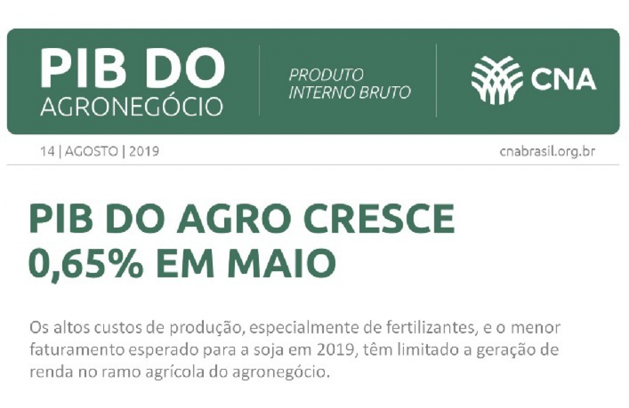 O Produto Interno Bruto (PIB) do agroneg?cio brasileiro teve alta de 0,65% em maio e acumula crescimento de 0,68% nos primeiros cinco meses de 2019, segundo a Confedera??o da Agricultura e Pecu?ria do Brasil (CNA) e o Centro de Estudos Avan?ados em Economia Aplicada (Cepea).