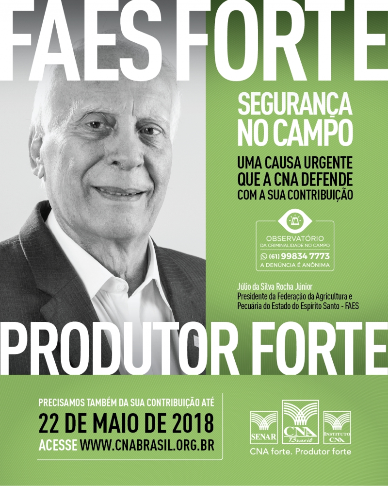 Atrav?s da Contribui??o Sindical Rural (CSR), o Sistema CNA, FAES e Sindicatos Rurais tem conquistado muitas vit?rias para o campo. Este ano, a principal bandeira ? a seguran?a no campo. Atrav?s do Observat?rio da Criminalidade, no site da CNA, estamos recolhendo den?ncias de crimes e encaminhando para as autoridades competentes, informa o presidente da FAES, J?lio Rocha.